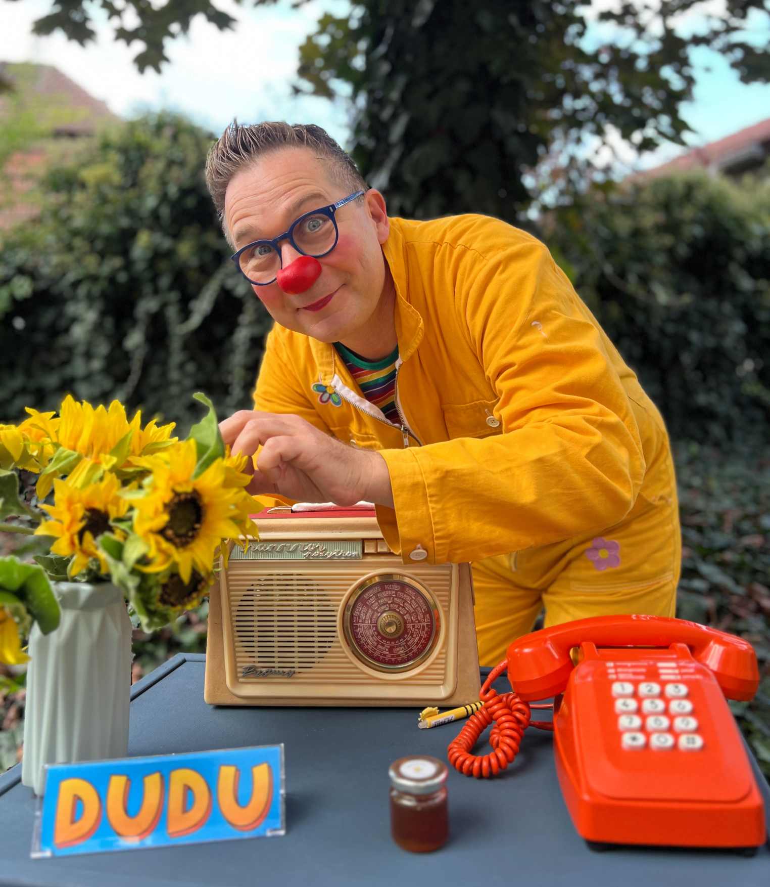 Clown Dudu, Fachbeauftragter für Bienen, ist eine sanfte und naive, jedoch auch sehr ernsthafte Figur.